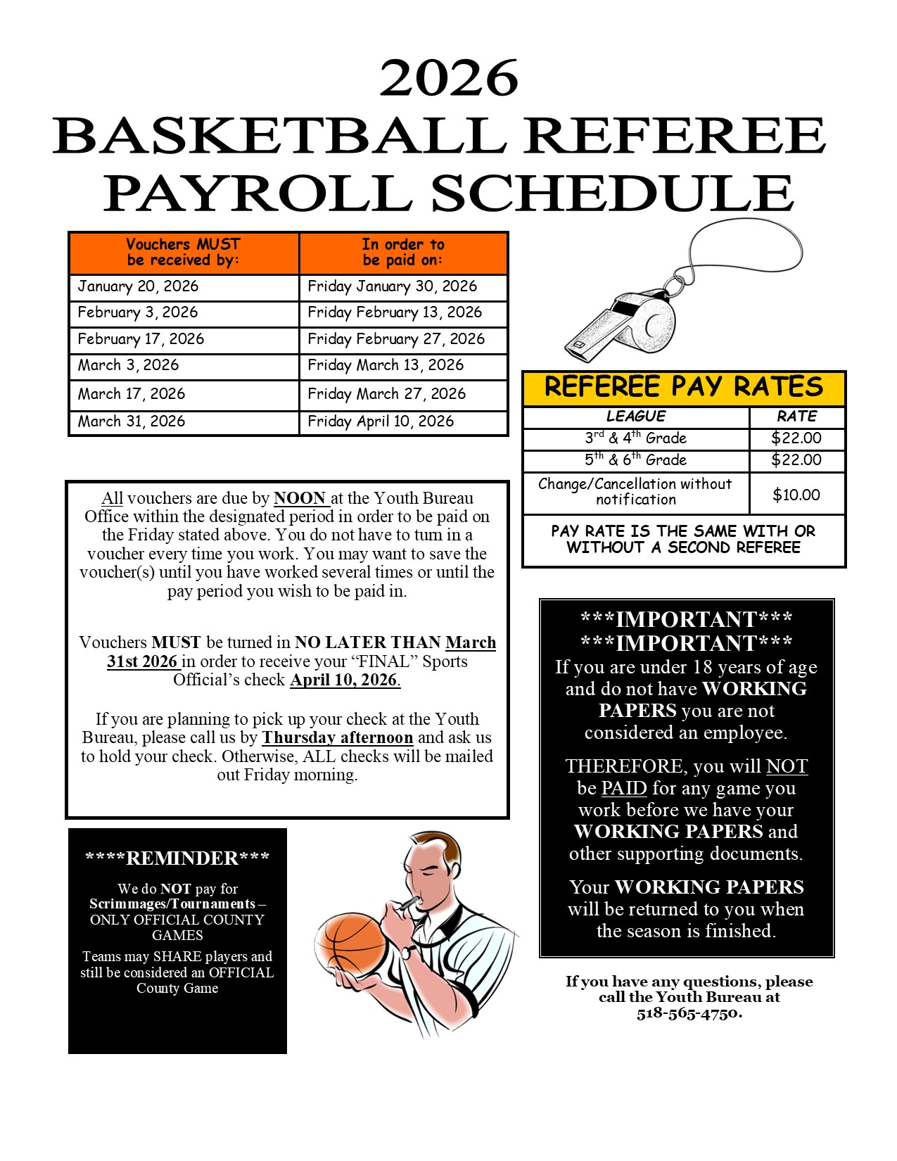 The Clinton County Youth Bureau hires and trains individuals 14 and older to act as Sports Officials for our Youth Sports Leagues. It is the responsibility of each Youth Commissions’ Sports Coordinator to assign officials for their home games from the approved list provided by the Youth Bureau. Sports Officials are in charge of the game, making all decisions and calling all violations. Sports Officials are required to attend the appropriate training sessions for each sport they wish to Officiate.