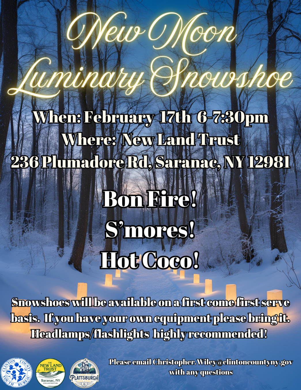 Join the Clinton County Youth Bureau and the Town of Plattsburgh Parks & Recreation Department for a NEW Moon Luminary Snowshoe at The New Land Trust on February 17th from 6-7:30pm! Trails will be lined with luminaries to help guide your way. There will be a bonfire accompanied by smores and hot coco to warm you up after your hike! Adult and Youth snowshoes will be available on a first come first serve basis.